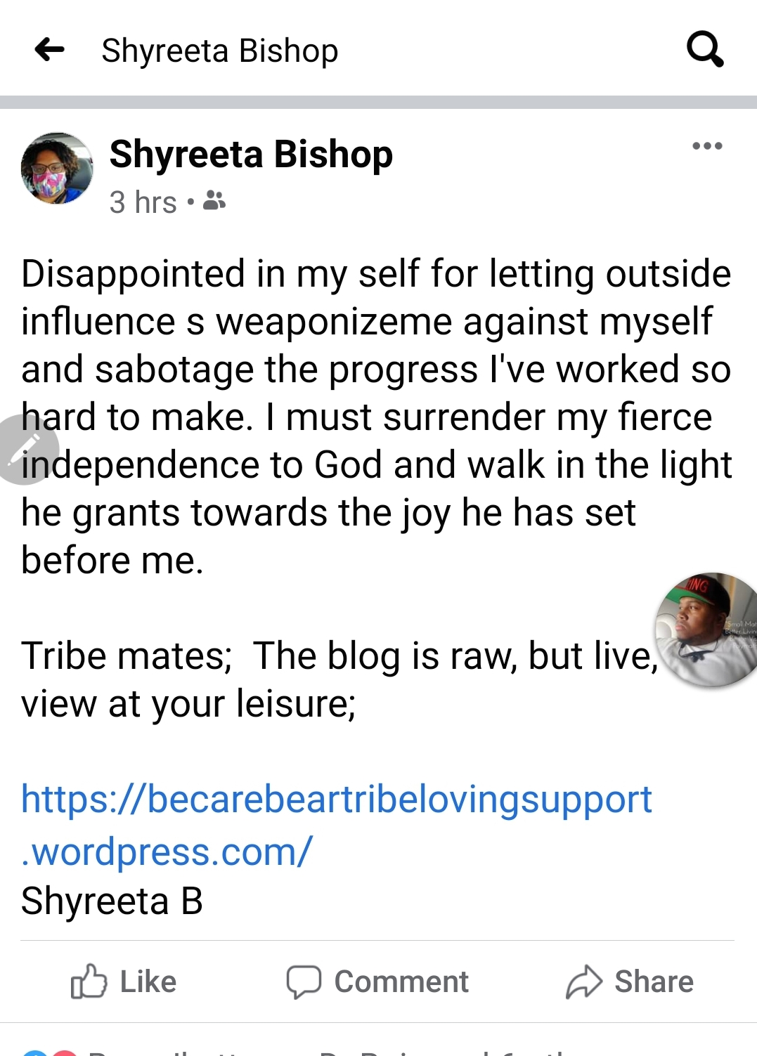 The last 2-3 years of my life have afforded me the opportunity to see Gods hand move in miraculous fashion on my behalf.And im here to share the blessings and lessons with those who could use Gods love raining down on them like a care bare stare.God canπππππ; I may come across a little fanatical but I’m just a humble seventh day Adventist that God has blessed with many mountain highs and valley lows to bless others hence Blessed to be a Blessingππππ